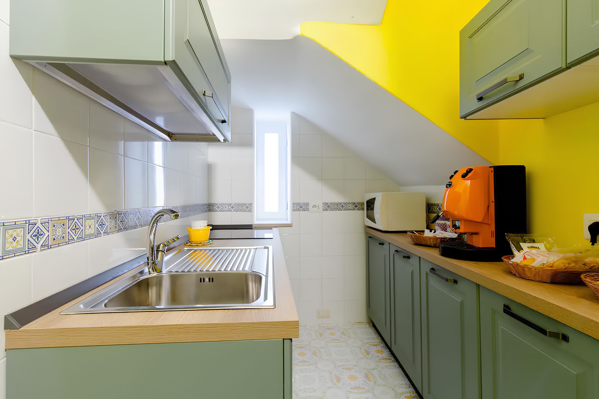 - Una cucina completamente attrezzata, dotata di tutti i principali elettrodomestici (come lavatrice, frigorifero, forno, microonde, etc.), che consente agli ospiti di preparare i propri pasti in totale autonomia.